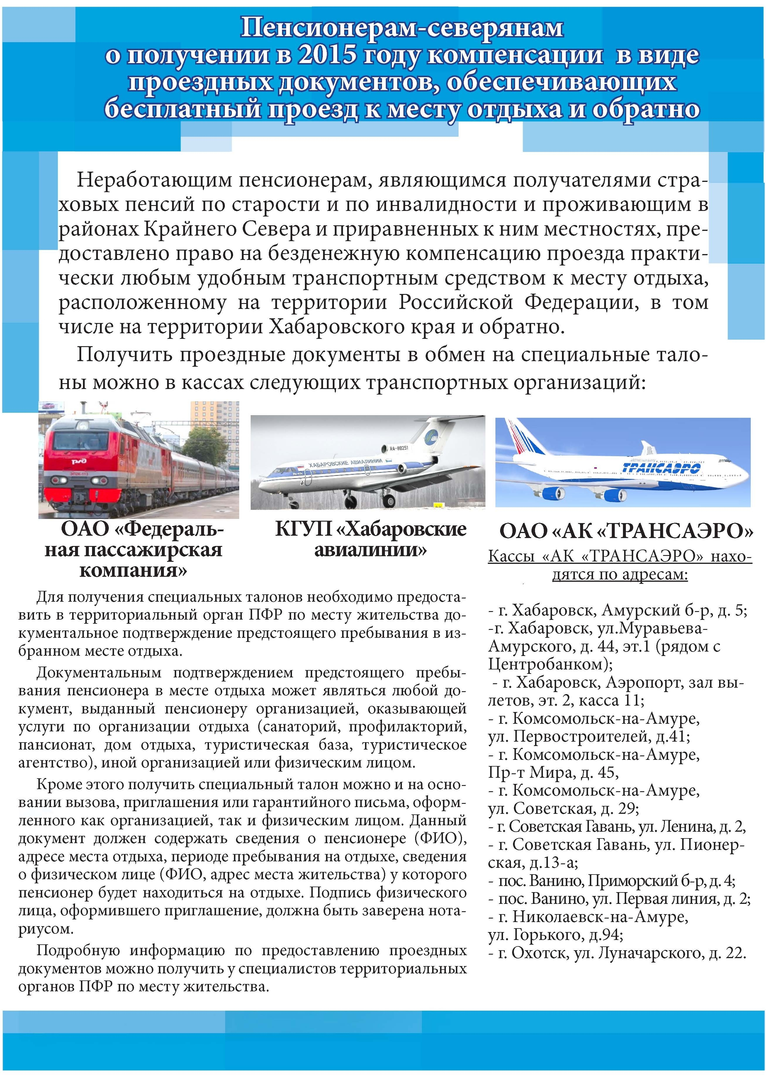 Пенсионерам-северянам о получении в 2015 году компенсации в виде проездных документов, обеспечивающих бесплатный проезд к месту отдыха и обрпатно |