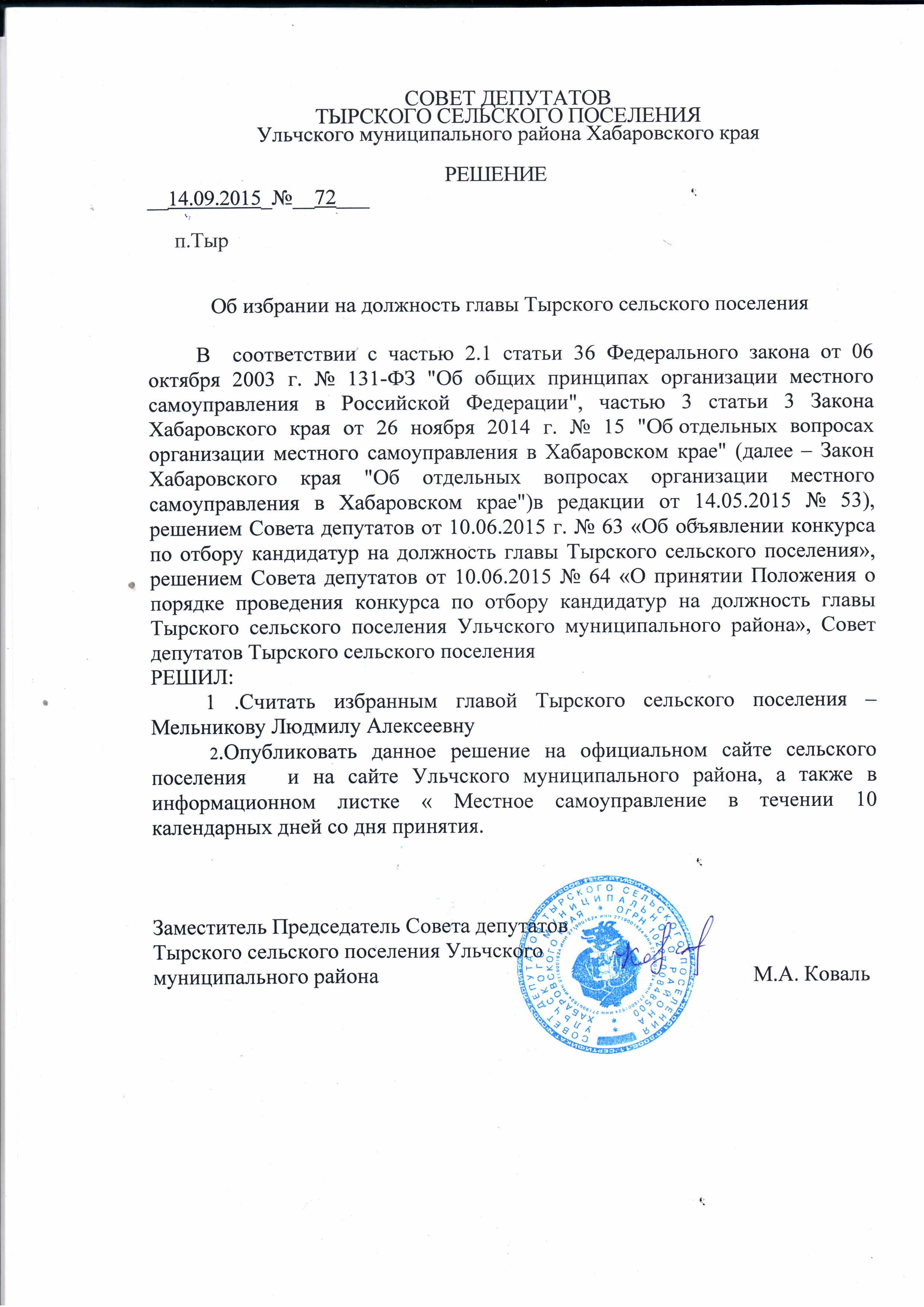 Решение Совета депутатов Тырского сельского поселения Ульчского мунципального района Хабаровского края от 14.09.2015 № 72 |